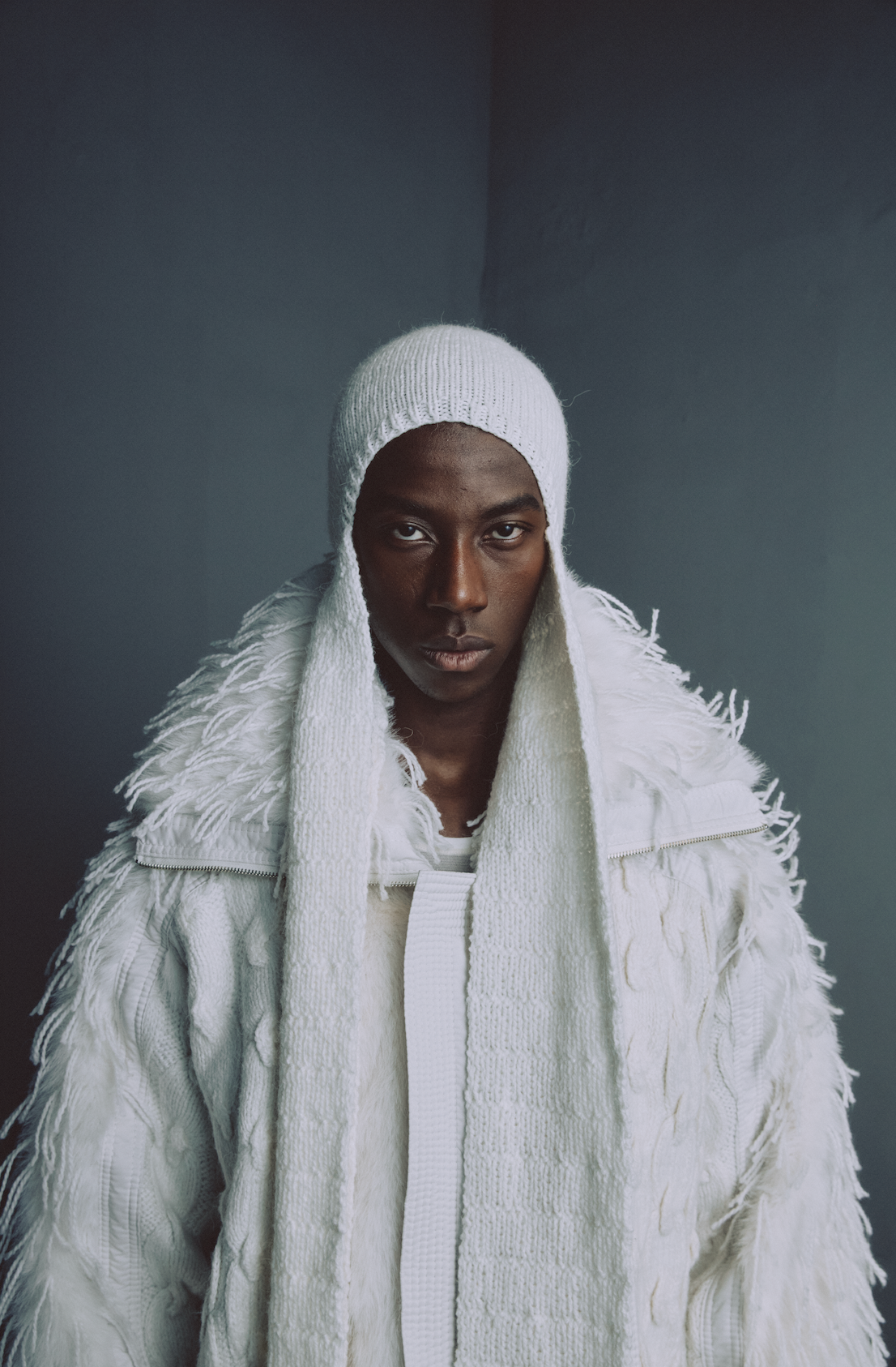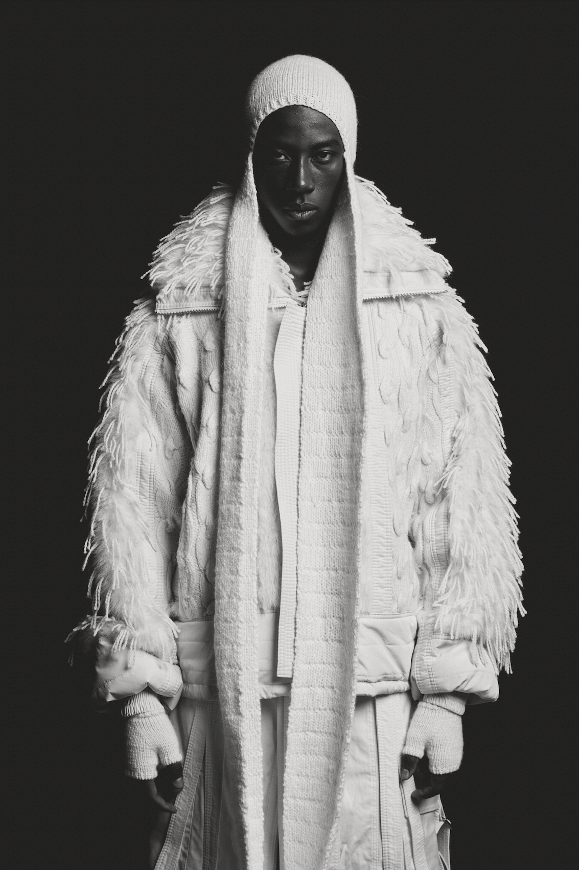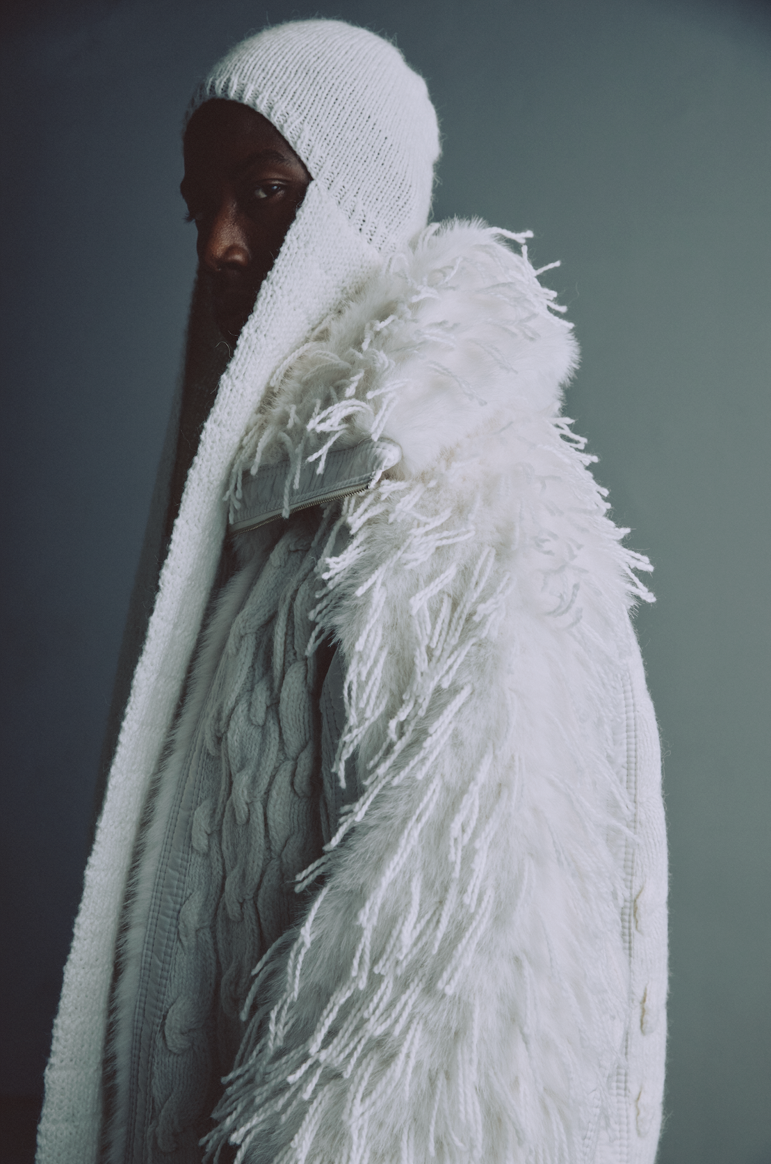 Bomber jacket tejida en técnica de dos agujas con acabado de desflecado, combinada con tafeta.