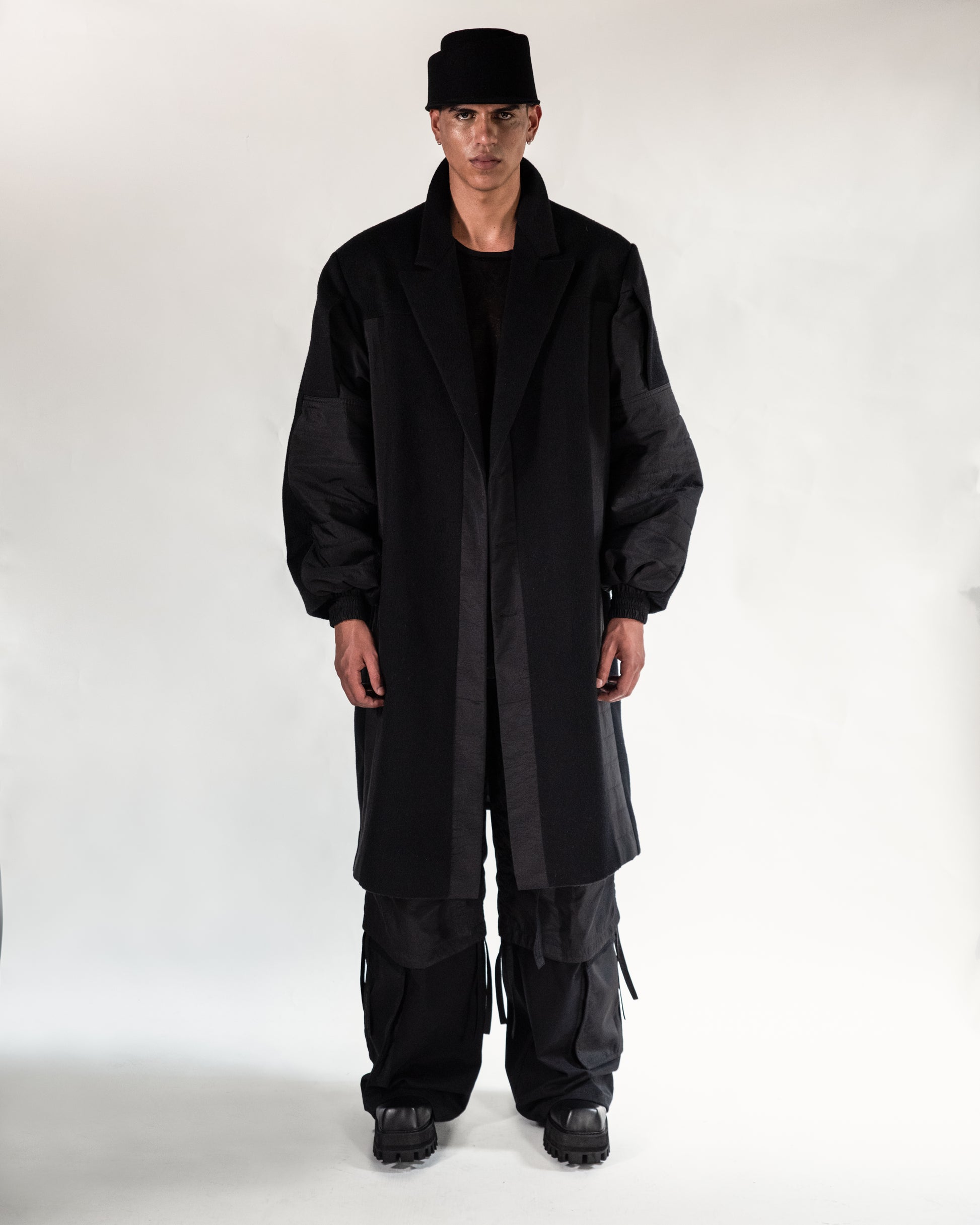 Abrigo de silueta clásica, solapa amplia con mangas deportivas, mezclando el paño con la estética urbana de la tafeta.