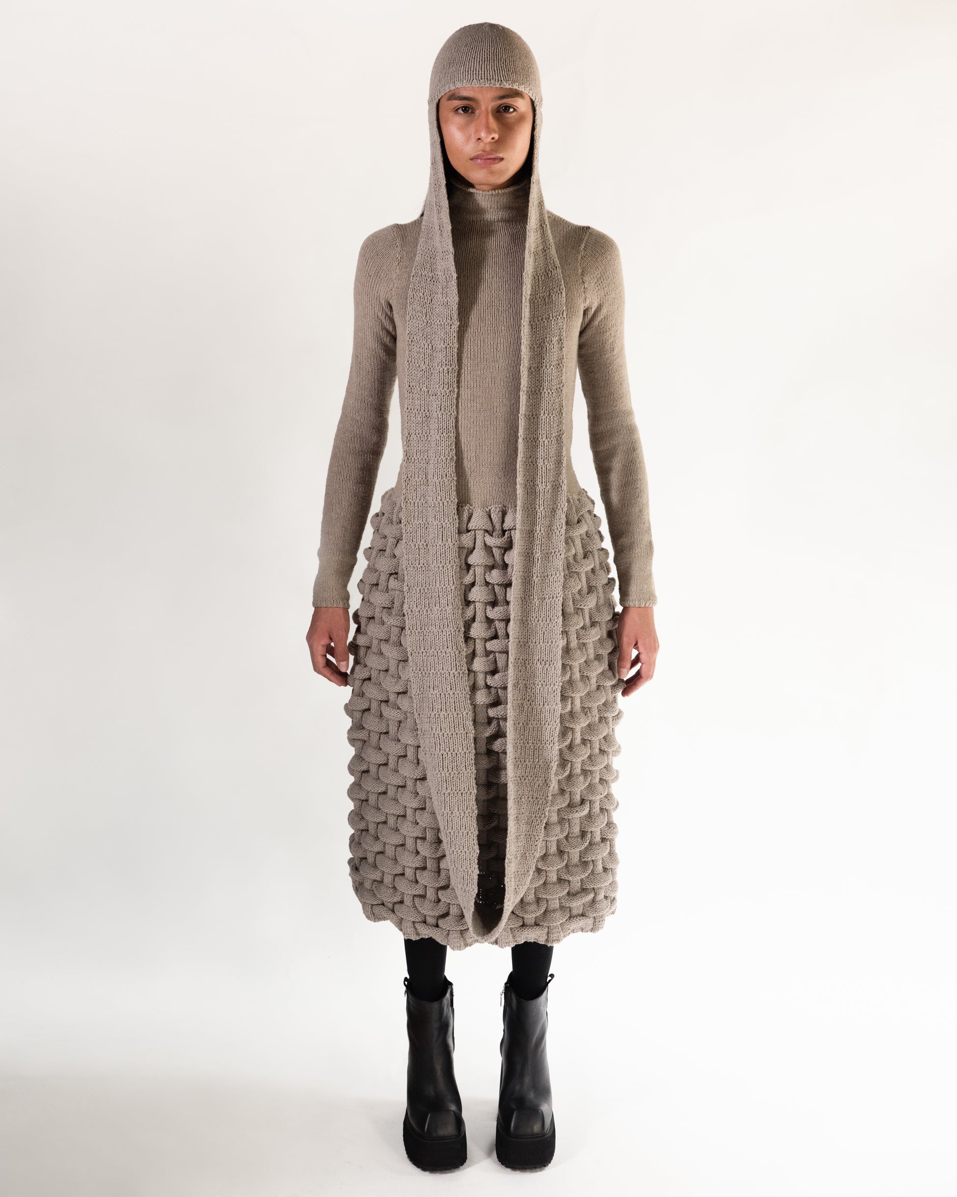 Vestido tejido a mano de cuello alto y mangas largas, la textura del tejido está inspirado en los canastos que se usan en el campo como objeto doméstico.