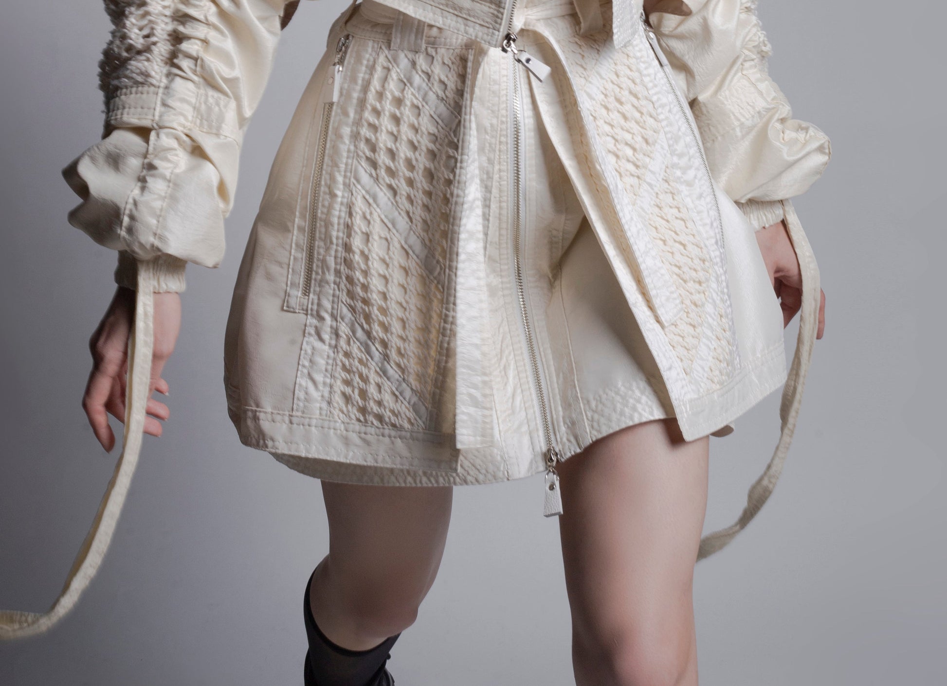 Minifalda deportiva con un mix de materiales entre algodón y tafeta. Tejido a mano en dos agujas con patrón de cestería.