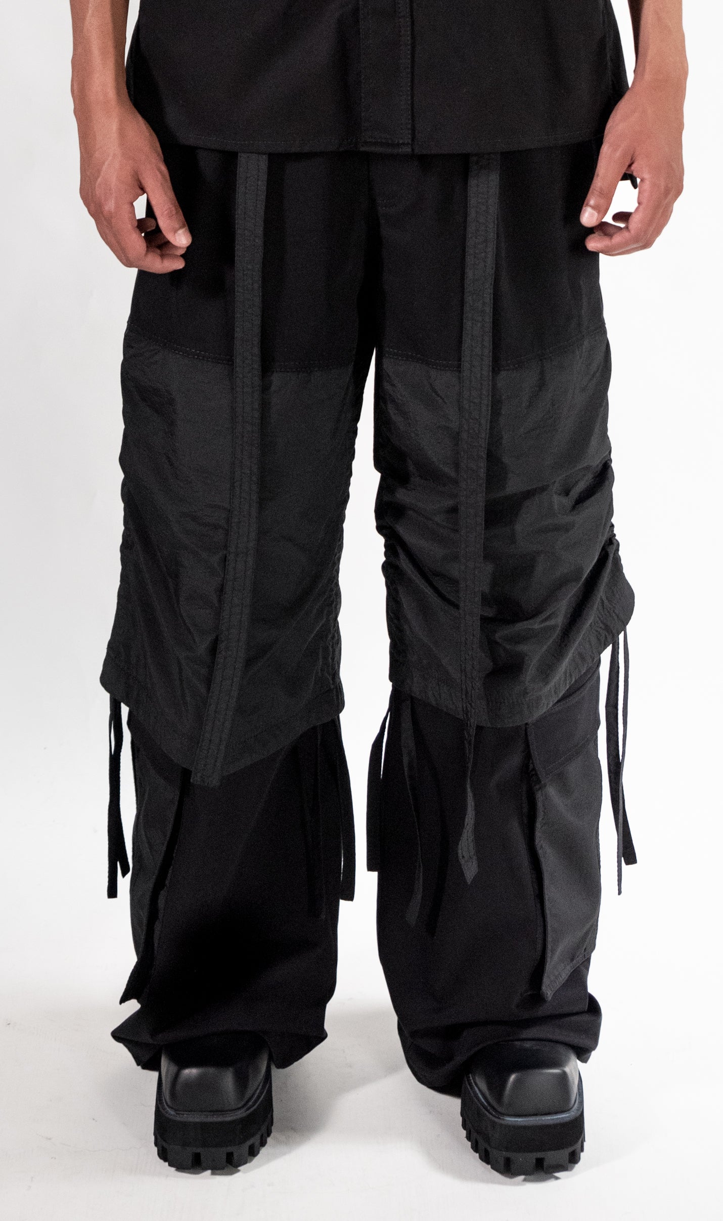 Pantalón deportivo confeccionado en algodón con bolsillos cargo, lazos ajustables y el efecto de recogido en las rodillas con tafeta que se puede graduar para generar textura.