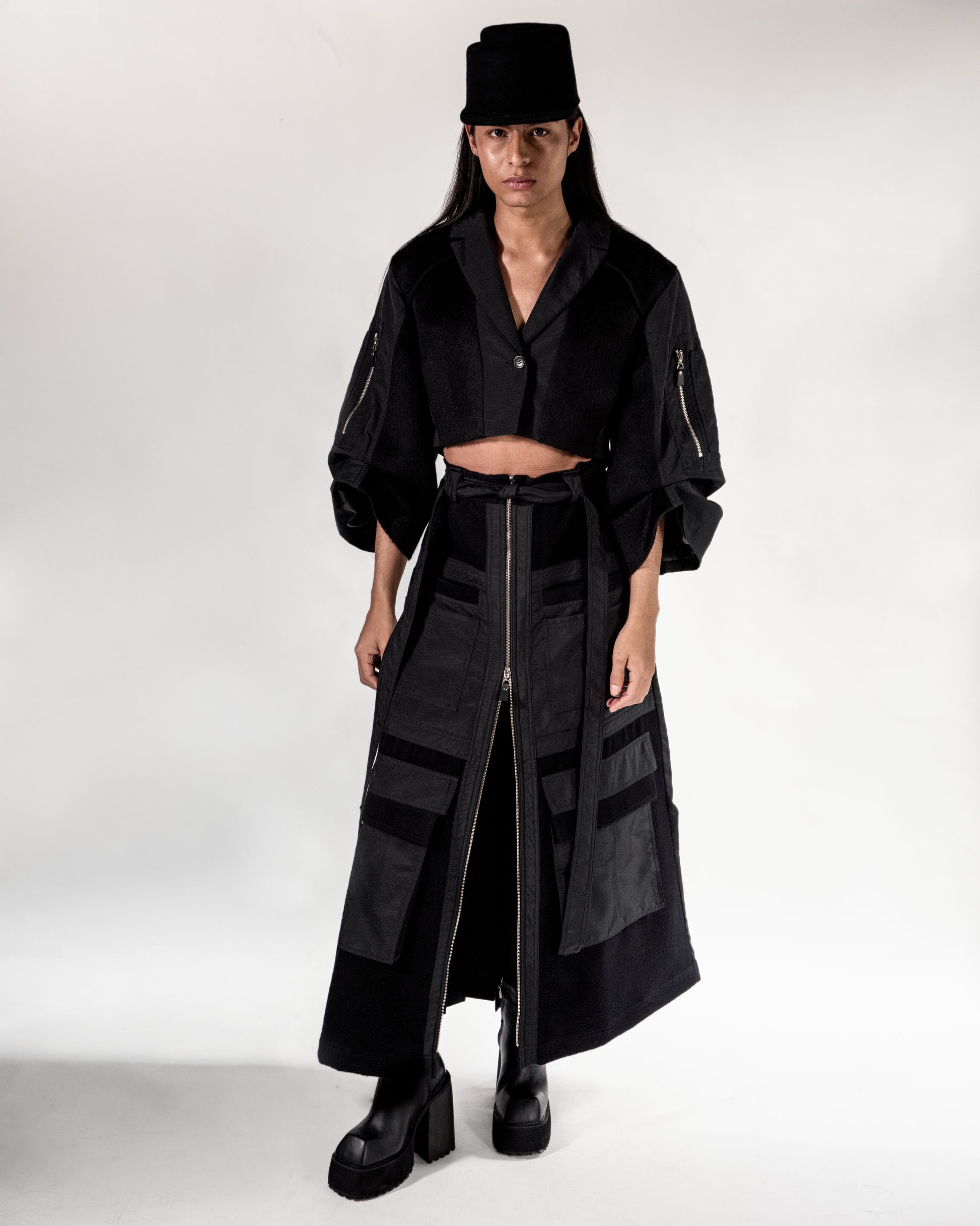 Blazer que mezcla la silueta sartorial y deportiva, además de materiales entre paño y tafeta.
