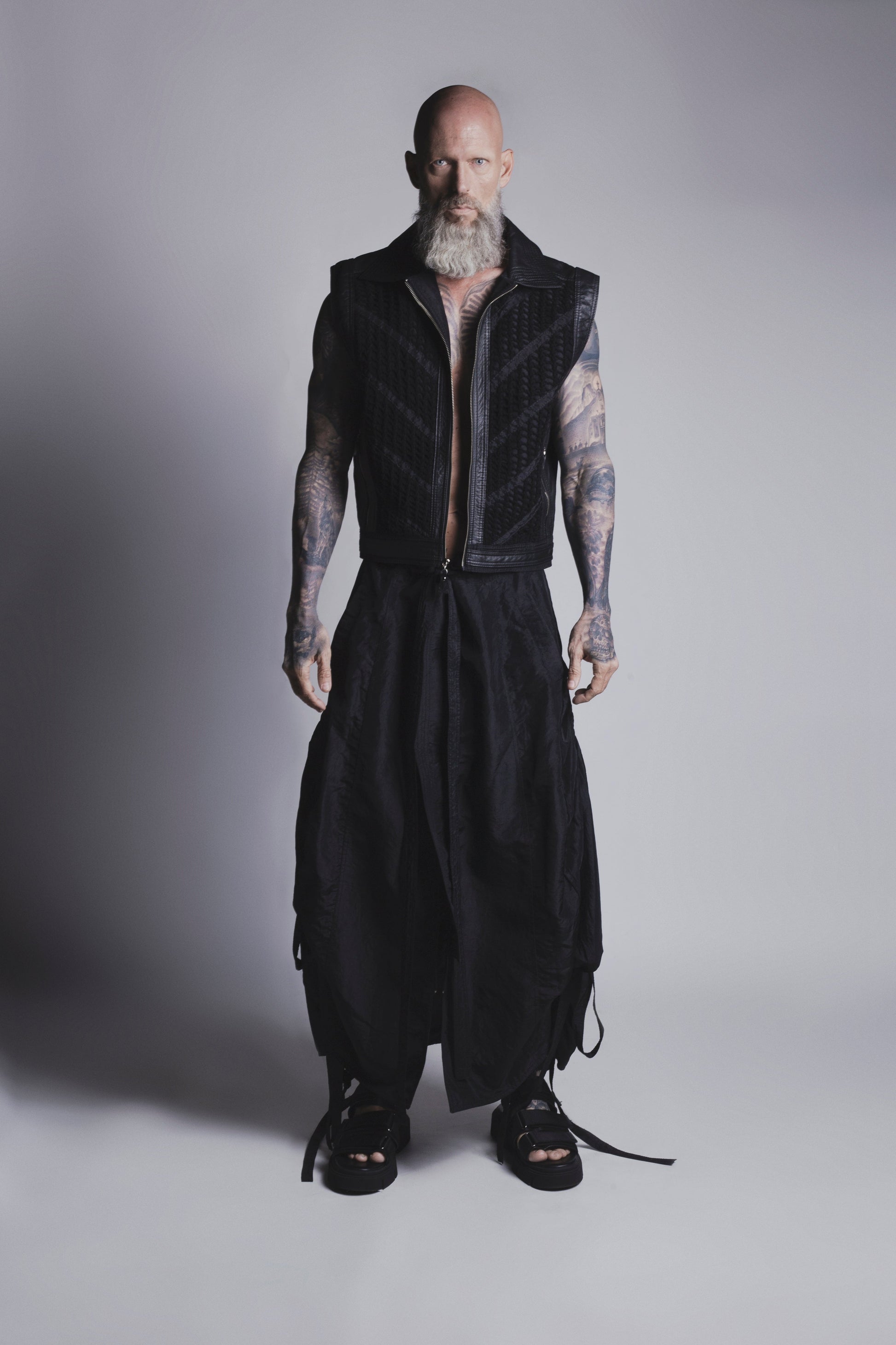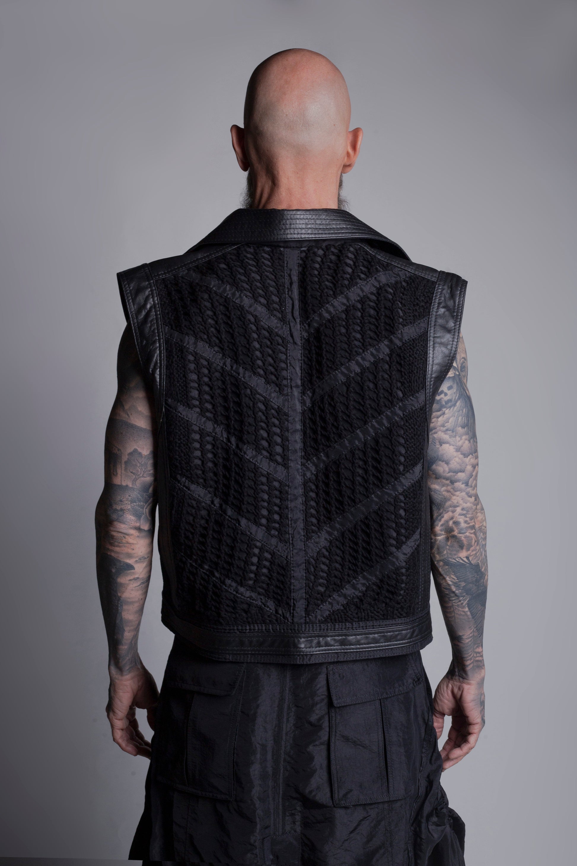 Chaleco de silueta regular, tejido a mano en algodón en técnica de dos agujas, con patrones lineales en tejido liviano. Tiene adiciones de cuero que dan peso a la silueta.