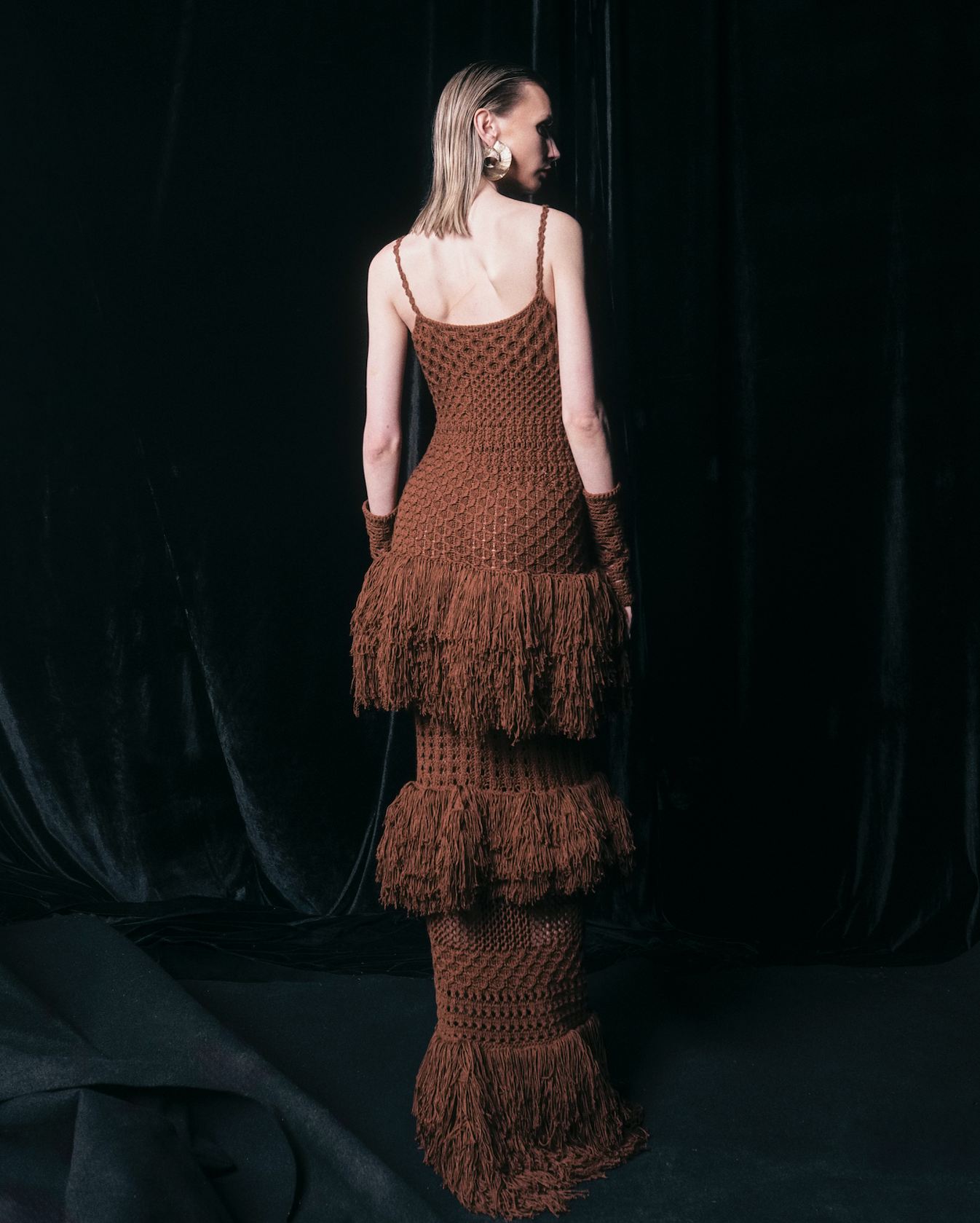 VESTIDO LARGO SIN MANGAS, TEJIDO A MANO EN TÉCNICA DE CROCHÉ, CON DIFERENTES TEXTURAS Y CAPAS DE FLECOS