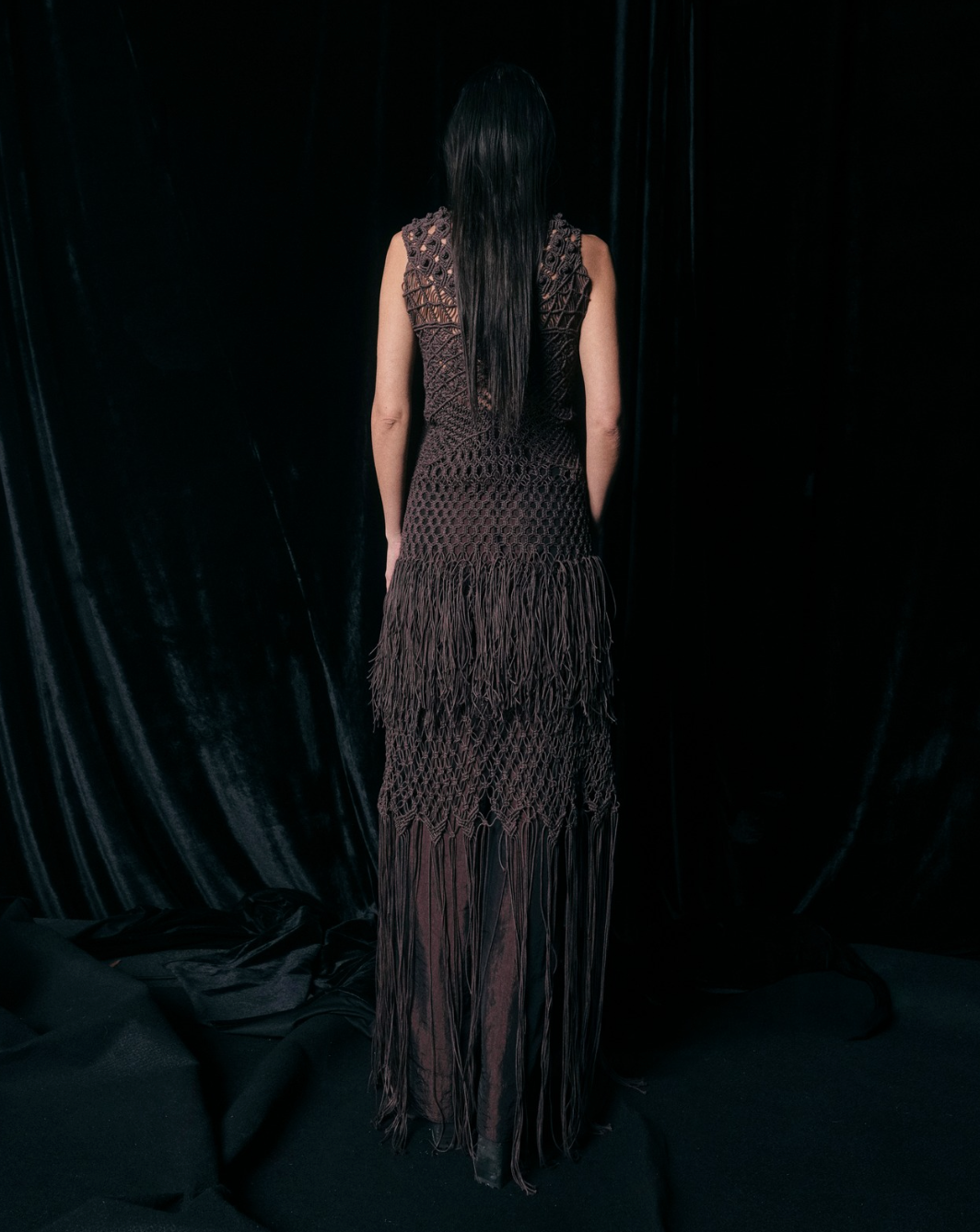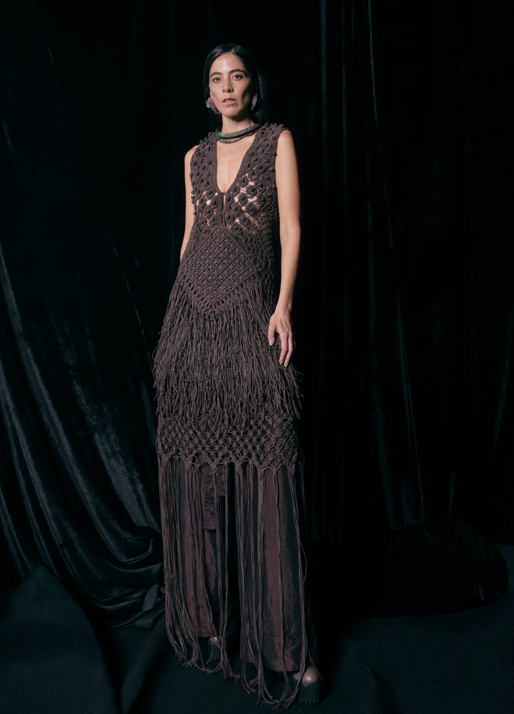 VESTIDO LARGO TEJIDO A MANO EN TÉCNICA DE MACRAMÉ CON DIFERENTES TEXTURAS Y TERMINADOS EN FLECOS