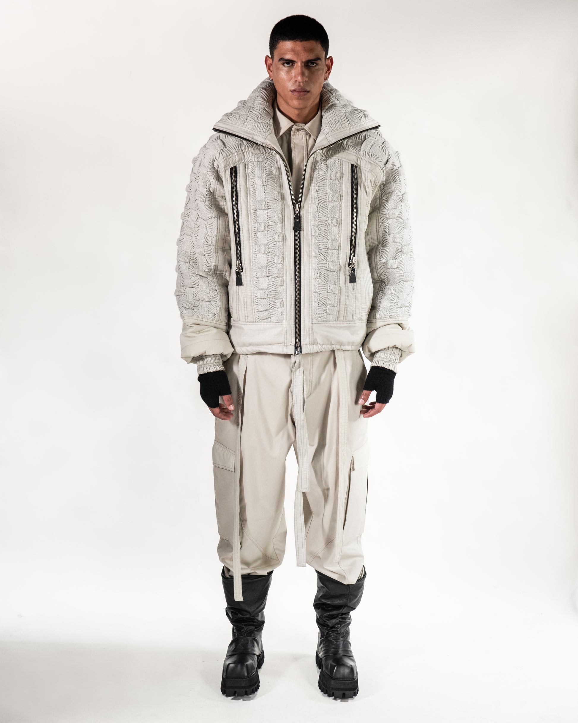 Chaqueta de cuello alto de doble tejido y cremalleras frontales y laterales. Es tejida a mano en técnica de dos agujas con textura inspirada en los canastos que se usan en el campo como objeto doméstico.
