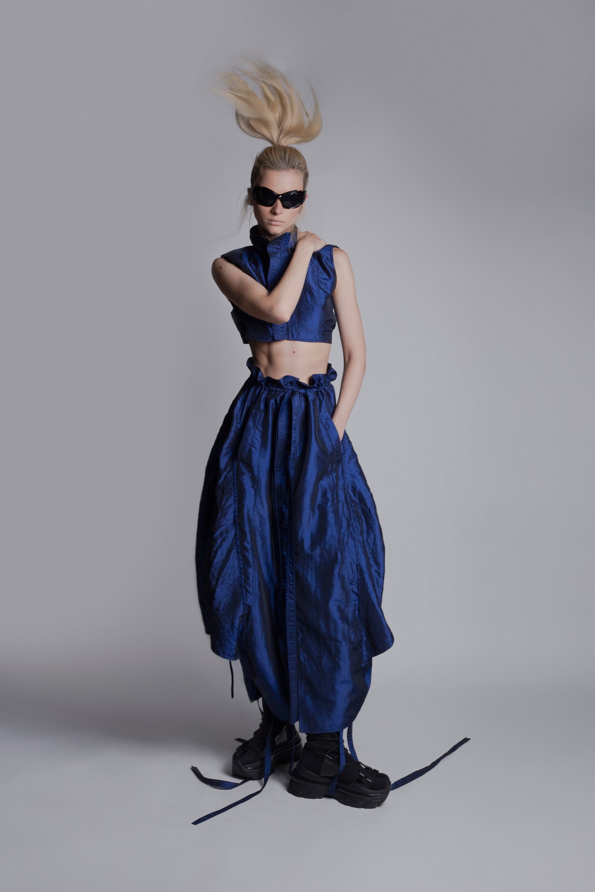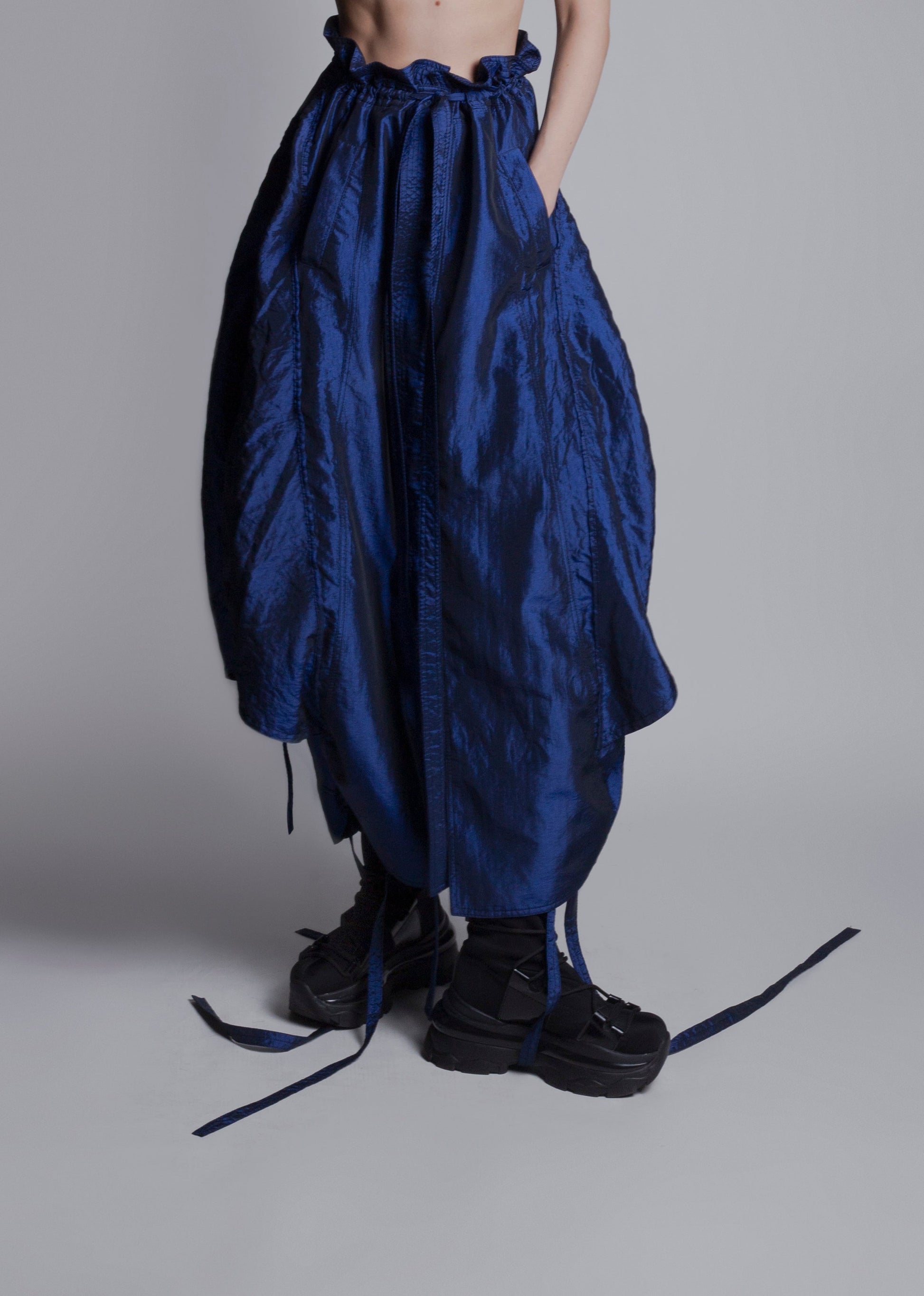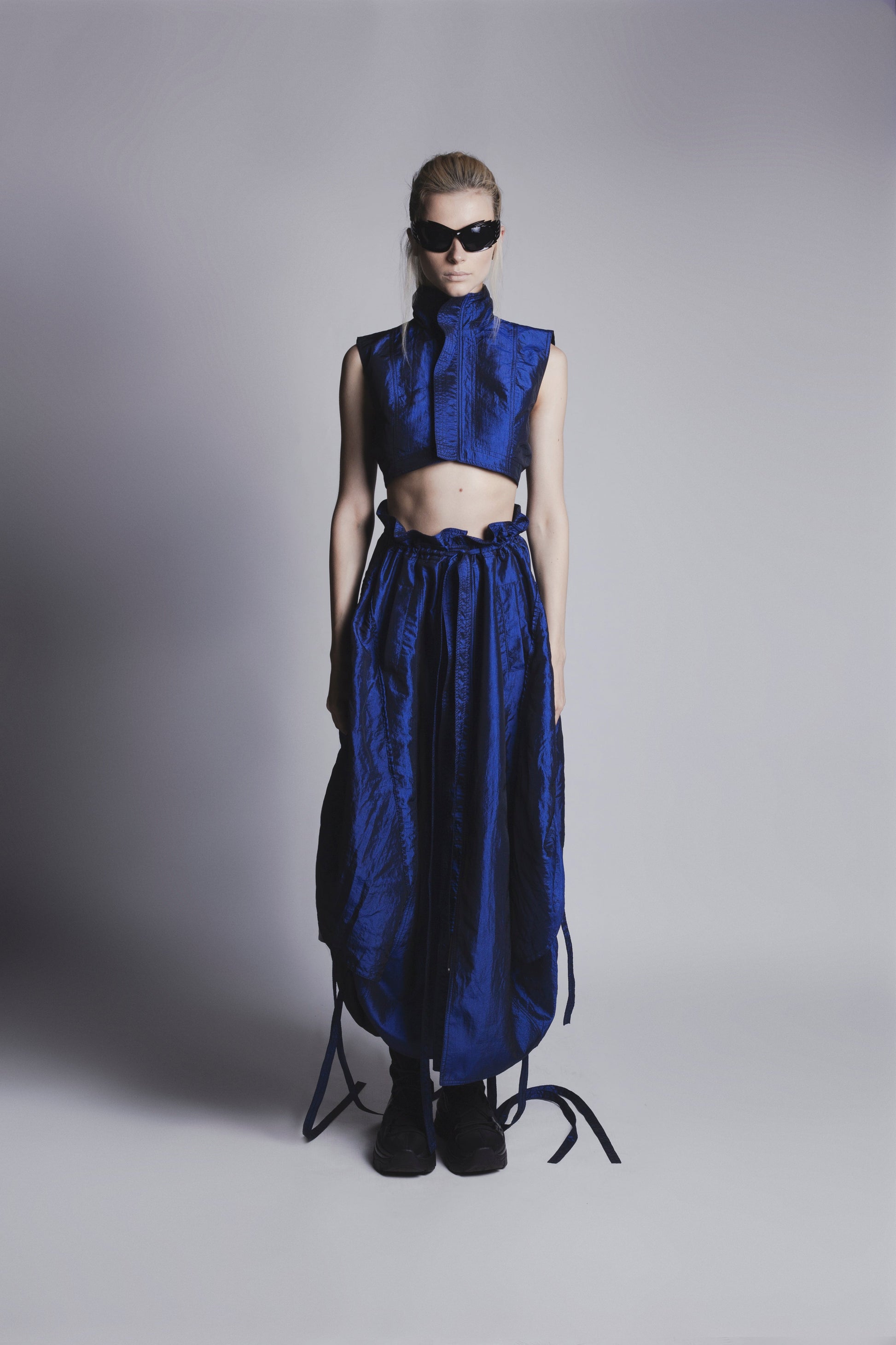 Falda deportiva confeccionada en tafeta con lazos laterales que cambian la silueta de del volumen y cinturón en el mismo material con efecto paper bag en cintura.