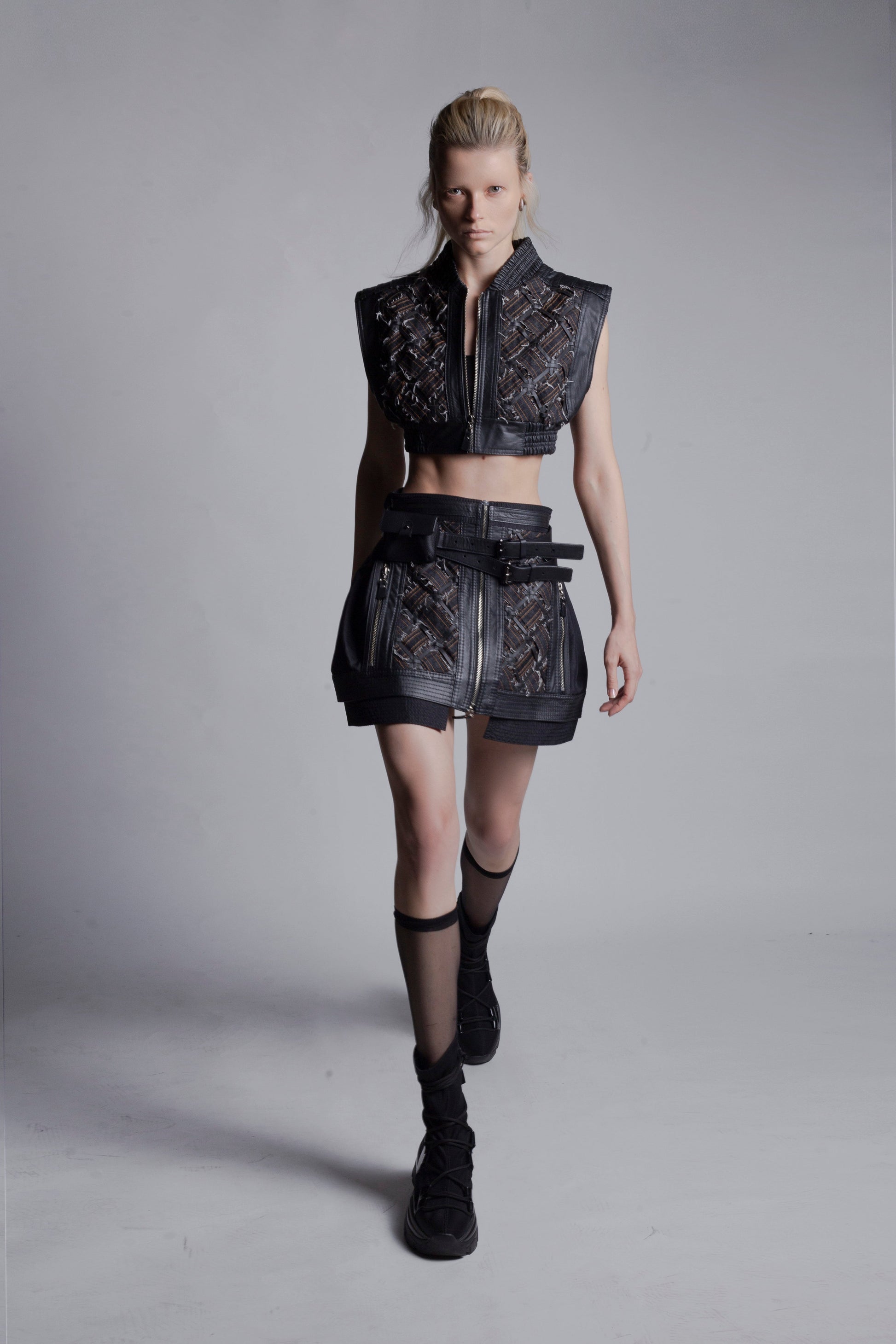Minifalda confeccionada en un mix de materiales cuero y denim, tejido a mano con denim reciclado en técnica de cestería con cortes lineales en cuero.