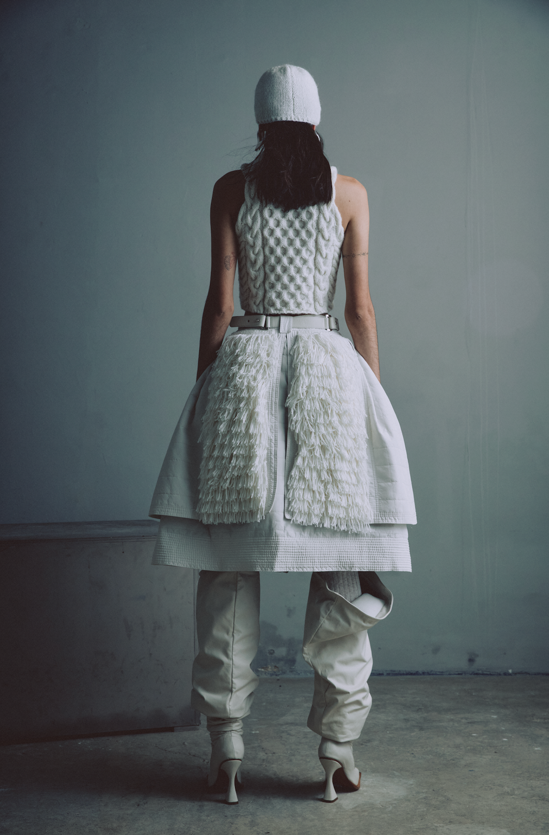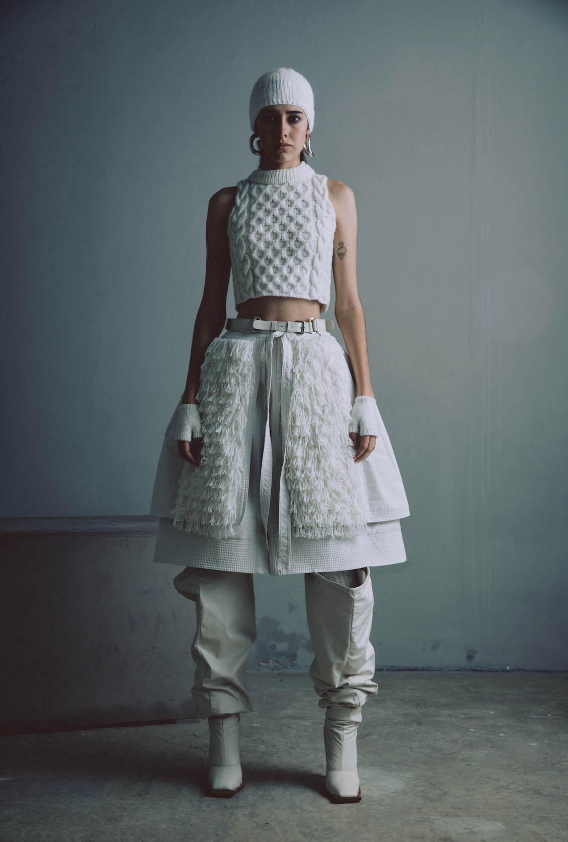 Falda deportiva con cremallera frontal y trasera. Además de bolsillos laterales y cinturón ajustable en el mismo material deportivo. La pieza tiene una mezcla de material con lana en técnica de desflecado.