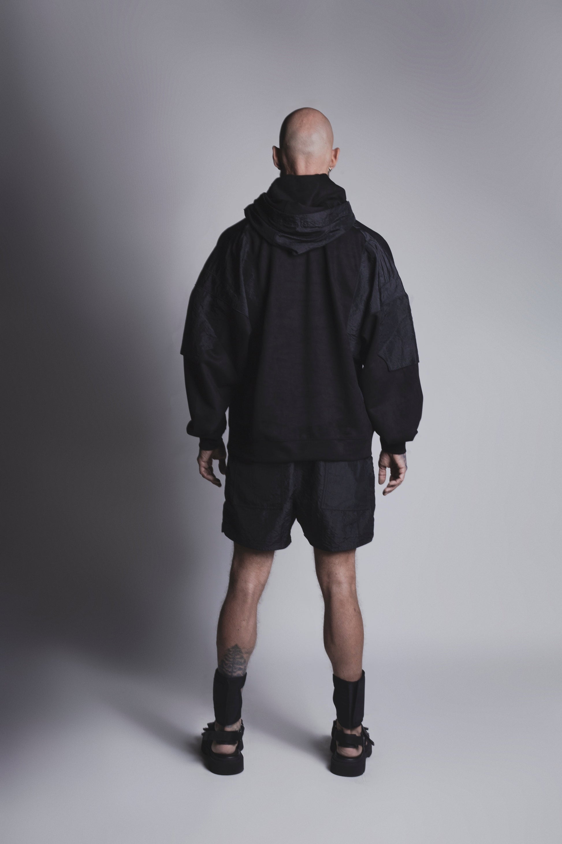 Suéter deportivo con capota y bolsillo frontal. La prenda tiene un mix textil entre gamuza y tafeta.