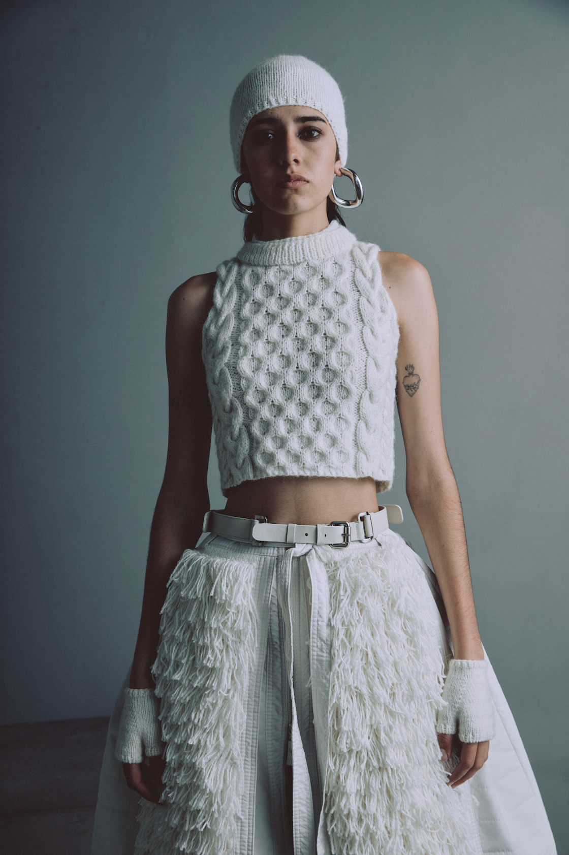 Suéter sin mangas, tejido a mano en técnica de dos agujas con textura inspirada en canastos del campo colombiano.