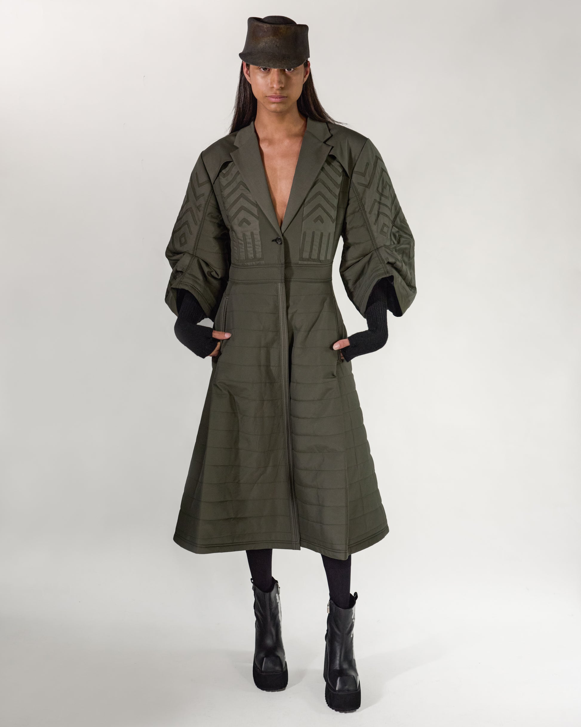 Vestido bordado a mano por mujeres indígenas de la comunidad Gunadule. La silueta está inspirada en la estética sartorial y falda amplia con mangas oversize.