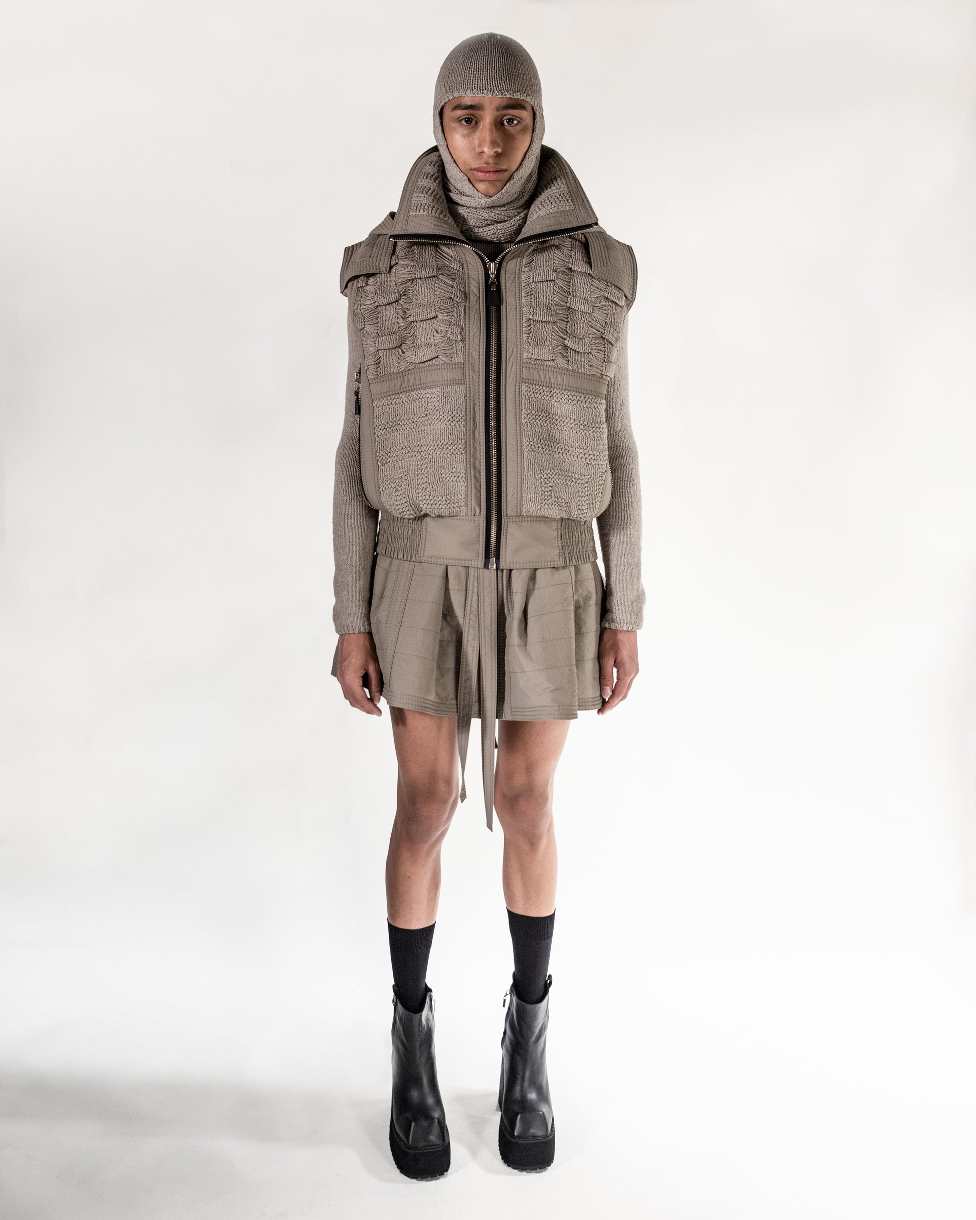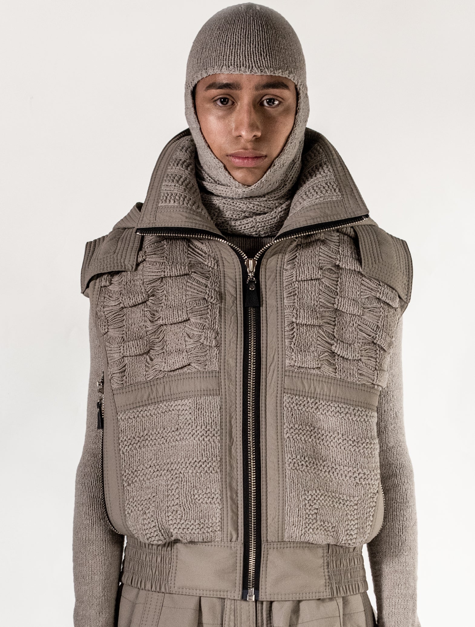 Chaleco tejido a mano en técnica de dos agujas con textura en alto relieve, inspirado en canastos usados en el campo.