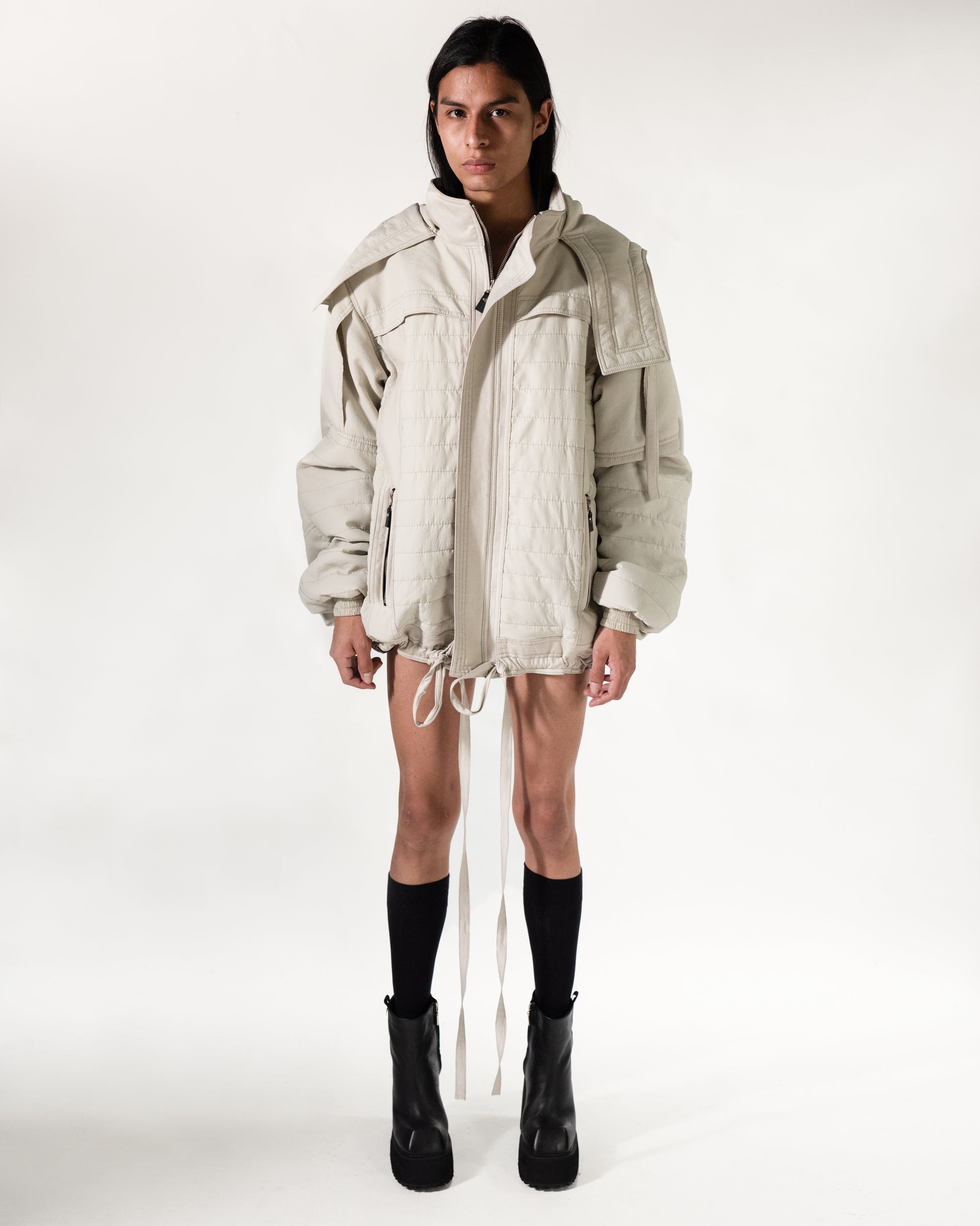 Chaqueta deportiva con capota y doble cuello, con textura capitonada, bolsillos laterales y lazo ajustable que transforma la silueta.